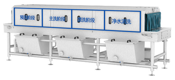 環速容器滅菌清洗機,是一款多功能的容器清洗設備,具有清洗、滅菌、除水的功能,流程自動化,無須人工參與。設備整體采用隧道式設計,劃分出了清洗段與除水段。清洗段又分為預洗、主洗、漂洗、凈洗四個環節,分別負責不同的清洗職能。預洗利用大流量噴淋模擬浸泡的效果,用于軟化頑固污染,同時能夠去除淺表性的油污、泥土及霉斑;主洗利用高壓,負責去除泡軟后的污垢和病菌微生物;漂洗起到的是高溫漂燙的作用,能夠去除零星的殘留物;凈洗是常溫噴淋,目的是使容器恢復潔凈,并完成降溫。