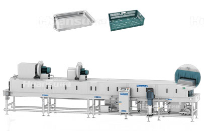 容器滅菌清洗機的清洗,不只是去除筐盤上的污漬這么簡單,它還具有滅菌和除水的功能。為了滿足清洗后的筐盤符合食品級的衛生標準,是不使用化學清洗劑的,從而避免化學殘留。因此設備采用的是高溫高壓噴淋的方式,通過具有加熱功能的水箱、高壓水泵以及環繞式布局的噴頭,對容器進行全方位無死角的沖刷。高壓水流可以將表面污漬軟化并充分剝離下來,高溫則可保障滅菌的質量。由于清洗后容器表面殘留水分,無法直接投入使用,為此設備在清洗段后端專門配備了用于除水的風干機和烘干機,利用自主研發的風刀裝置產生高速風刀,可有效剝離和蒸發容器內外表面的水,達到隨洗隨用的效果。
