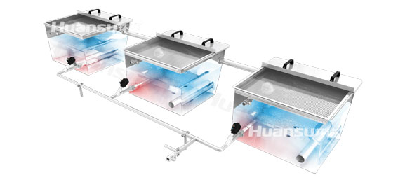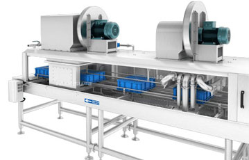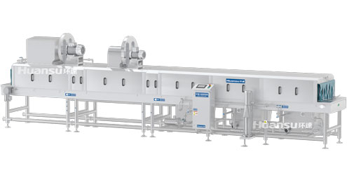 經過四步清洗后,容器快速恢復的潔凈,但表面還殘留著水分,不能直接投入使用,集中存儲時的積水問題也會導致二次污染問題。針對這一問題,容器清洗機特別設有風干和烘干兩種方案,客戶可根據需要自行選擇。風干是利用環(huán)速獨創(chuàng)的風刀裝置,產生高速氣流,利用康達效應,將容器表面的水分快速剝離;烘干則是利用蒸汽對風刀進行加熱,產生高溫熱風,除了風干,還可以利用高溫把水分烘干,除水效果更佳。如果對去水率有更高的要求,可以采用風干機與烘干機相組合的方式,甚至加裝多組風干烘干模塊。