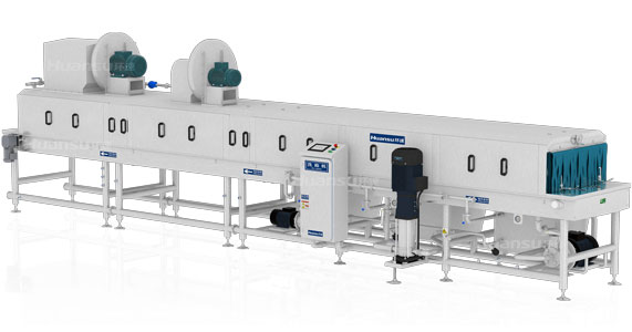 筐盤只清洗不除水,就如同上完衛生間不用手紙,流程不健全,后果就很難清爽。有道是,送佛送到西,機器洗筐盤不能止步于清洗,還需要充分除水,這是因為高潔凈度、高器具周轉需求的現代化生產線中,筐盤清洗后殘留的水本身就是一種污染物,它會改變食材原料的性狀,進而影響加工后成品的質量。食品質量不過關,吃完狂奔衛生間,萬一又忘帶手紙,妥妥成了惡性循環。為了保證筐盤滅菌去污后的清爽,環速容器滅菌清洗機在隧道末端專門設有除水段,配備了環速自主研發的風刀裝置,它同樣呈環繞式布局,且角度可調,能產生致密的高壓氣流,如庖丁解牛般剝離容器內外表面、加強筋死角、鏤空縫隙中的水分。以風干為基礎,在吸氣口配置蜂窩式加熱盤管,可吹出無孔不入的高溫氣流,將水分進一步烘干。如此雙管其下,便可確保容器油膩地來,清爽地走。